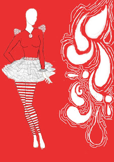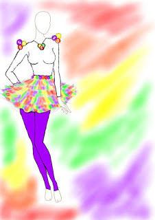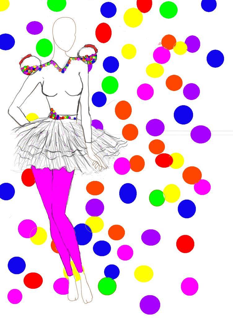 (Right)This is the original design. The big round object with little multicolored balls are made to represent a bubblegum machine that is leaking bubble gum all over the shirt and landing in a pile on the belt. This feature is what makes the design so complex. In addition to this, the outfit includes a white, long sleeved leotard, with a white tutu and pink leggings.