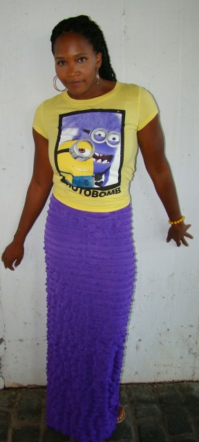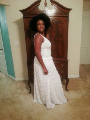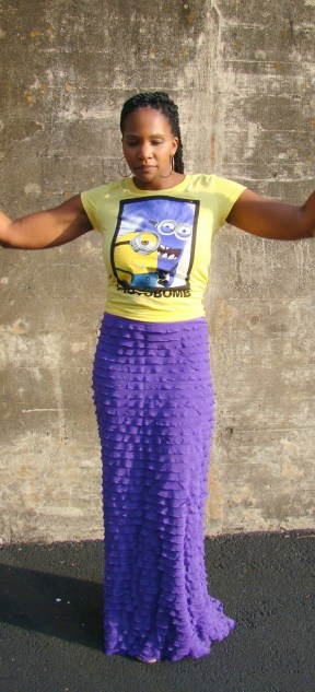 Once I figured out what type of fabric it was called ( Ruffle Knit) I went out and found it at my local Joanns .. the only ptoblem I found with their Ruffle Knit is that the Ruffle pieces where not nearly as long as the one Style Pantry is wearing … So I ended up making it once( in white) .. and then again in a really pretty purple that i found .