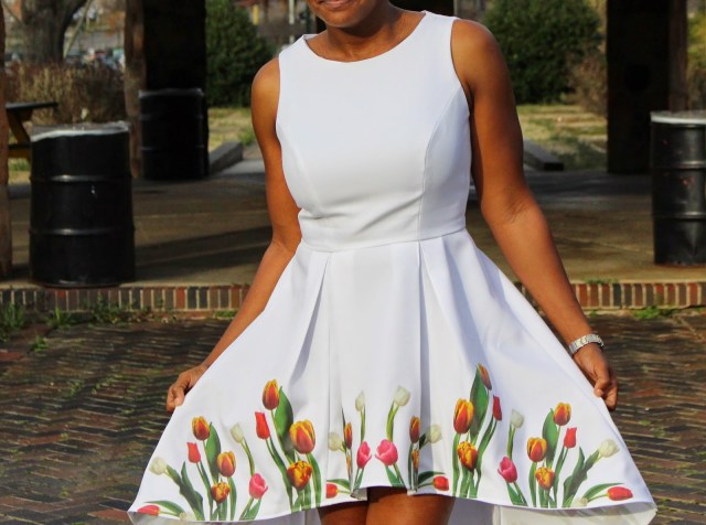 It took a few days for the paper to get here so in the mean time I finished my bodice and lining piece. Finishing the lining was a breeze but before I could join my lining to my bodice I had to complete my skirt portion . I found the image that I wanted to use on the skirt border ( tulips was actually my husbands idea) , printed it out on the paper and used a Heat Press to bond the image to the fabric .