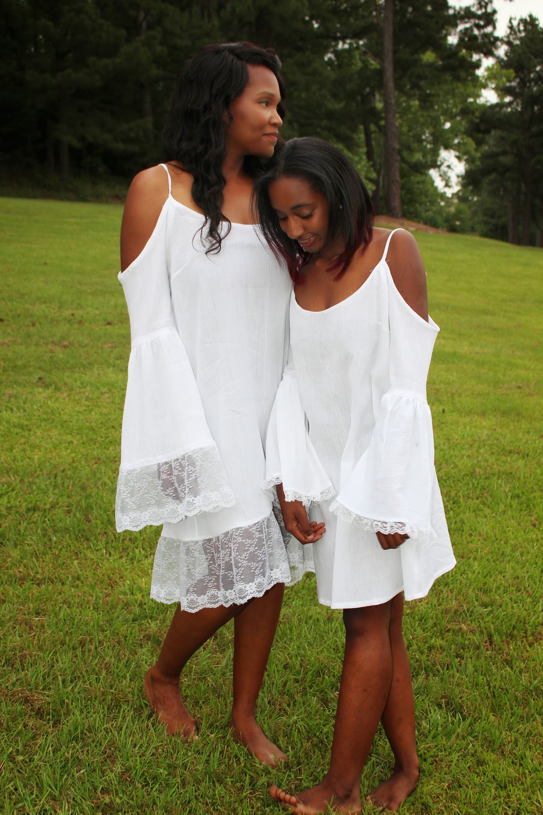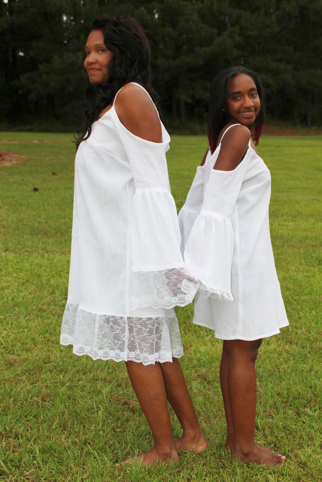 On the sleeves I kept the construction as noted in the pattern but omitted the trim in the middle , instead I added lace trim to the bottom of each sleeve . I used a larger lace on mine and a smaller one on my daughters .