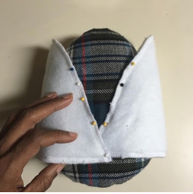 I used some fleece that I had purchased for another project to make the shoulder pads. I built the shoulder pads up by slowing decreasing the size of the original shape. I was going for a natural shaping of the shoulders so I didn\’t want to build it up to thick. I was sure to extend the shape out about a 1/2 inch past the end of his shoulder . Once I go the shape I wanted I hand stitched across the Fleece pieces and cut another piece ( original size) to sandwich the pieces together . I finished my using my serger to stitch around the perimeter .