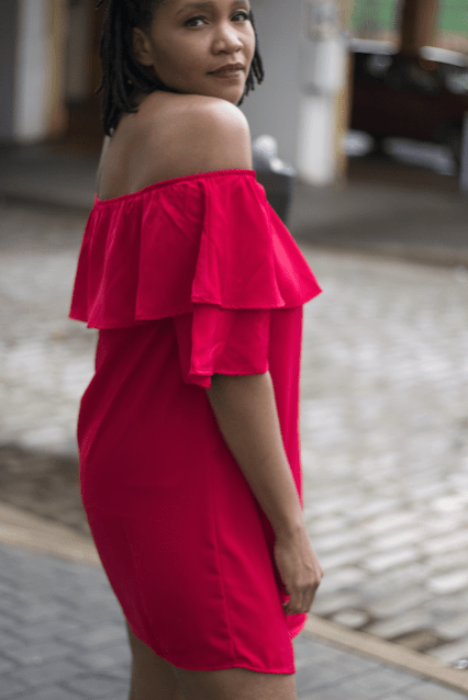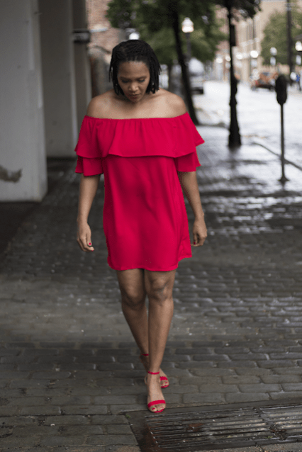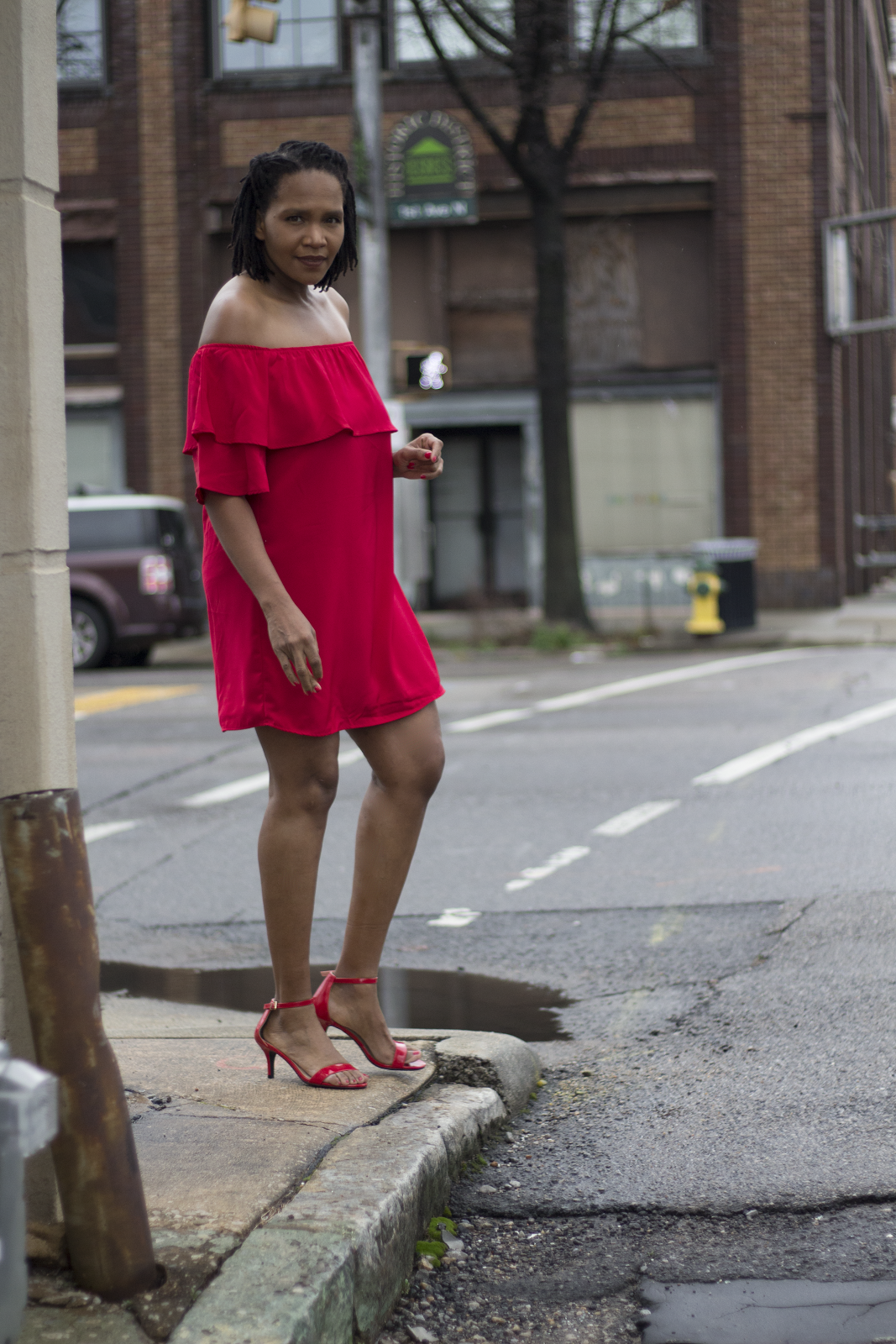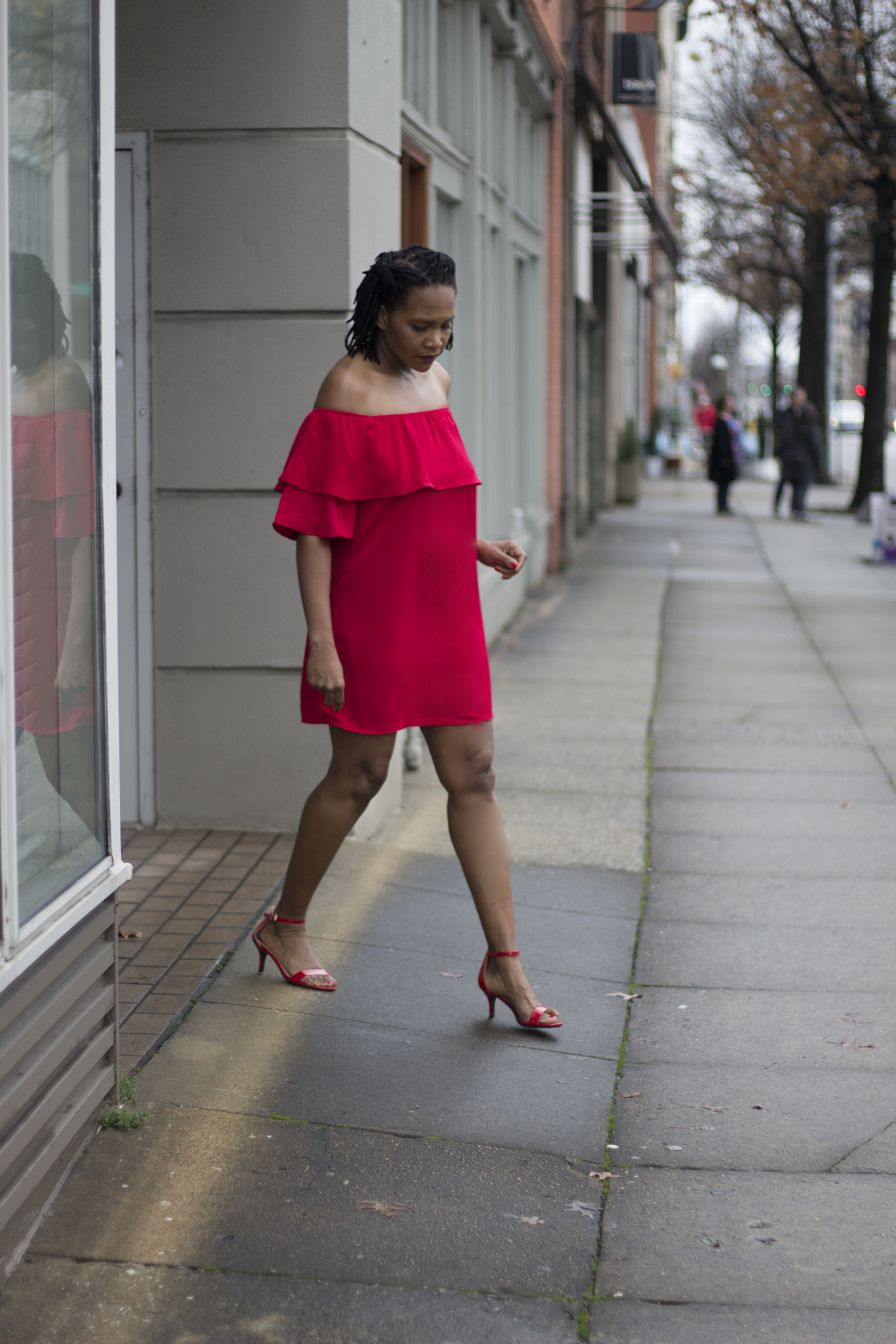 I paired her with some red minimalistic pumps because the dress is a statement all by it self.