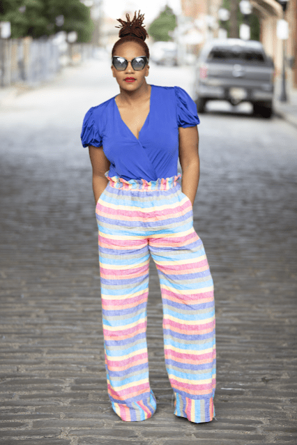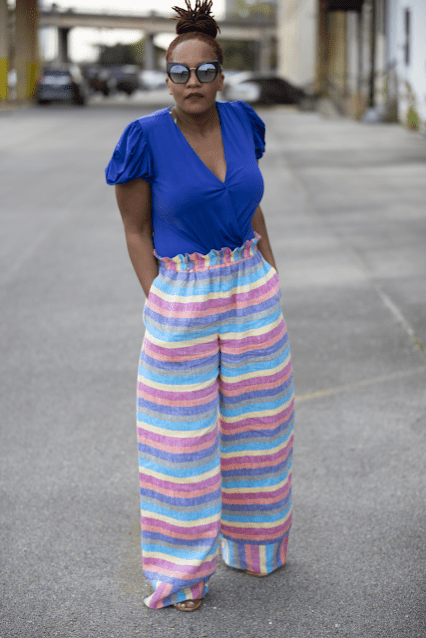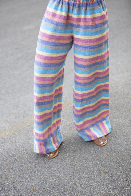 The real story behind this fabric is that I originally purchased the black and white striped linen fabric, seen in my last Linen play post. While out shopping for the fabric I saw this beautiful Multi-Color Fabric Linen. I picked up this linen but put it back down because I\’m just not a color person, but then I got home and saw how beautiful the fabric turned out with other garments and I decided I had the perfect make for it, wide leg paper sack pants!