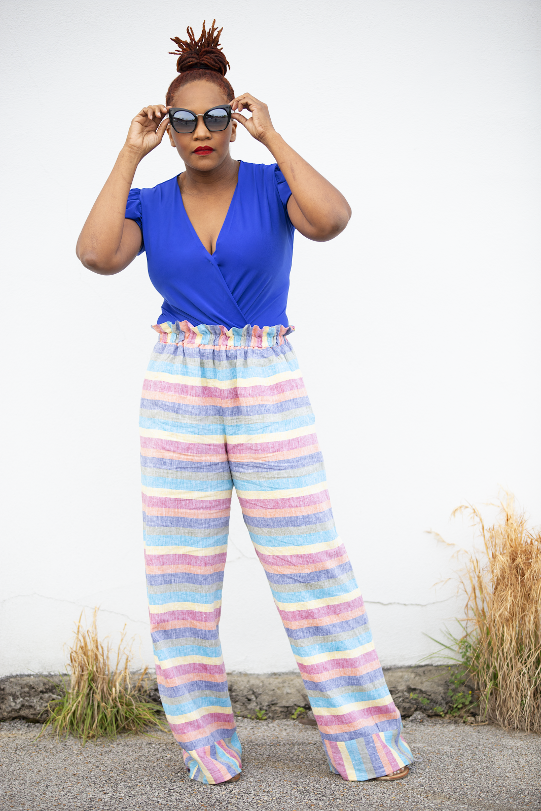 The real story behind this fabric is that I originally purchased the black and white striped linen fabric, seen in my last Linen play post. While out shopping for the fabric I saw this beautiful Multi-Color Fabric Linen. I picked up this linen but put it back down because I\’m just not a color person, but then I got home and saw how beautiful the fabric turned out with other garments and I decided I had the perfect make for it, wide leg paper sack pants!